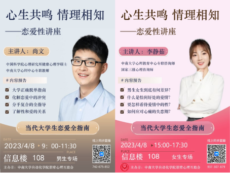 4月8日,由必赢766net手机版朋辈心理互助会主办的“心生共鸣,情理相知”恋爱与性主题讲座于信息楼108顺利举办,本次讲座分为男生和女生两个专场,分别于上午9:00和下午15:00准时开始。本次讲座采用线上线下相结合的形式,旨在进一步提升同学们对大学阶段恋爱与性的了解,培养健康的恋爱观、正确的性认知。受邀担任男生专场主讲人的是中南大学心理中心尚文老师,负责女生专场的是中南大学心理教育中心李静茹老师。男生女生专...