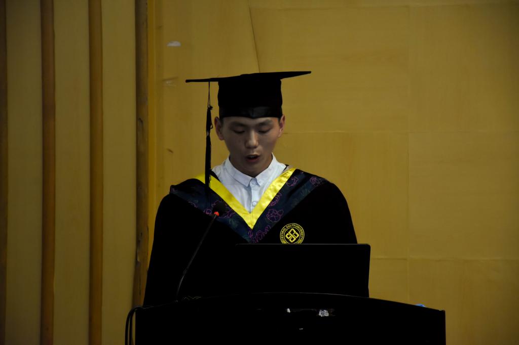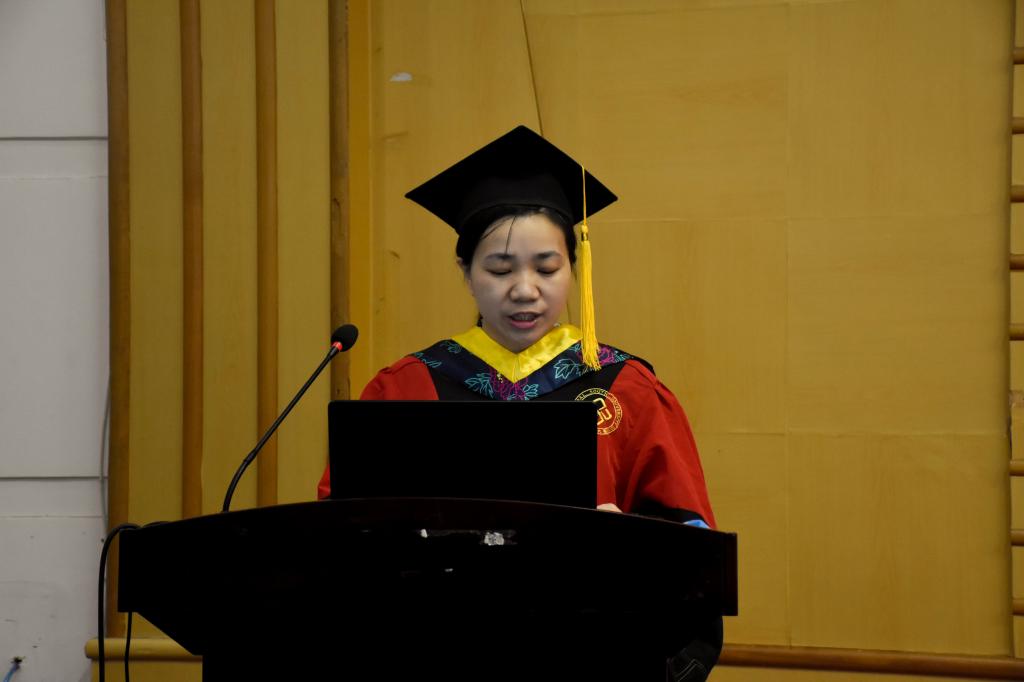 会议伊始,全体奏唱国歌,全场气氛庄严,洪亮的歌声回响在小礼堂内。紧接着由王一军书记宣读必赢766net手机版2019年毕业生学位授予名单,必赢766net手机版2019年共授予博士、硕士和学士学位近700人。毕业生代表张俊俊同学结合自身丰富多彩的大学生活经历进行了毕业生代表发言,表达了对母校的感激与不舍也展望了未来的目标与理想。