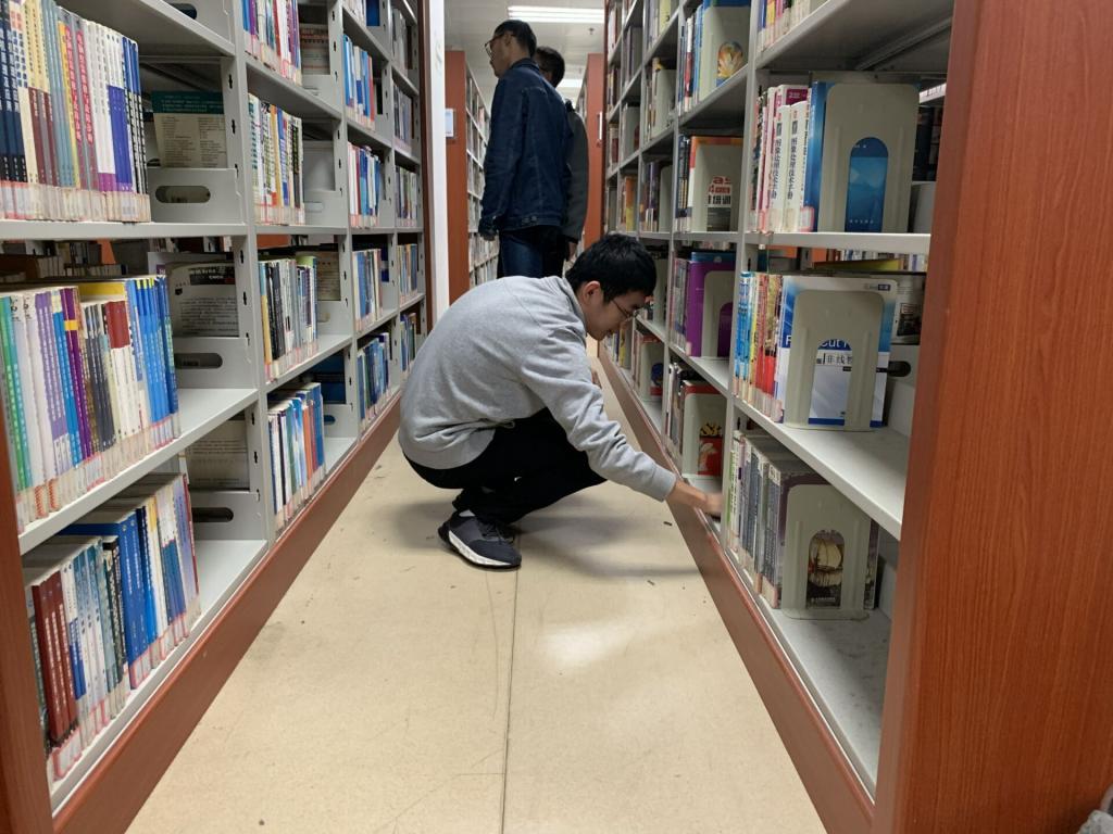 伴随着长沙秋季的绵绵细雨,同志们早上8点就在新校区图书馆门口集合。经图书馆工作人员的指导示范后,他们开始了图书馆志愿服务工作。在图书馆二楼,能看到他们穿梭于书架间的身影,提桶打水、擦拭书架、整理书籍,每一个细小动作的背后都是对“为人民服务”的真切实践。