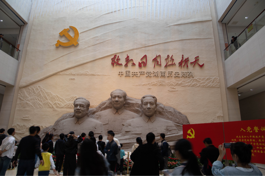 “敢教日月换新天”,走入展厅,就能看到这样气势磅礴的一句话,党史陈列馆以这句话为主题,为我们揭开了一幅波澜壮阔的历史画卷。在这句话的下方,是名为”潇湘魂”的毛泽东、刘少奇、任弼时三位伟人的雕像,加上右侧的入党宣誓词,一股庄严肃穆的气氛扑面而来。