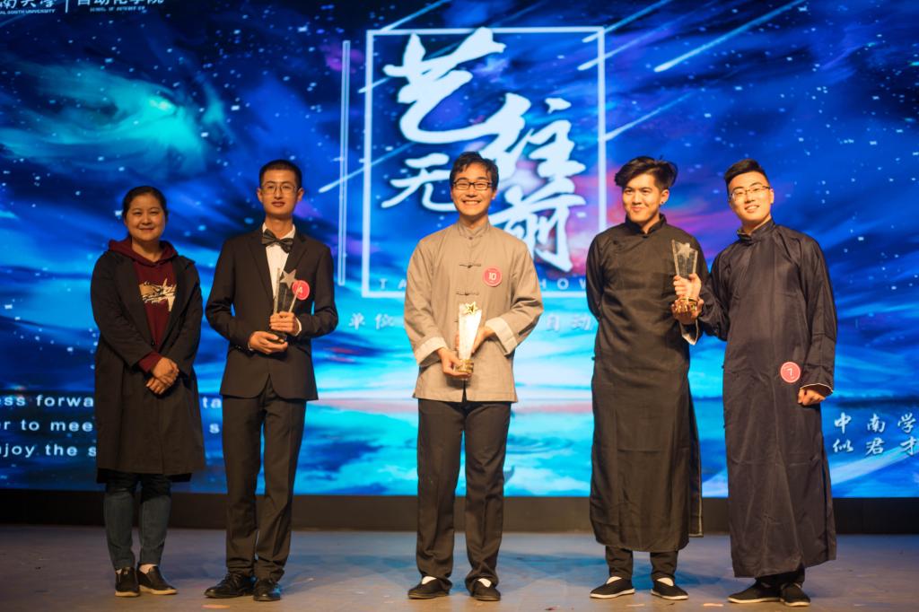 整场比赛台上台下互动良多,礼堂里洋溢着自动化学子的热情与活力。经过激烈角逐,研究生李德昀以其惊艳的京胡独奏《夜深沉》获得冠军,相声《艺术人生》的表演者孔祥煜、王家振获得亚军,练习钢琴十四年的茅艇峰获得季军,学院党委黄亚副书记为他们颁奖并合影。