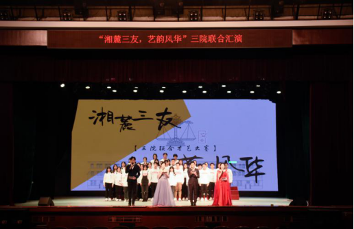 2020年11月28日晚,第一届“湘麓三友,艺韵风采”三院联合汇演在中南大学南校礼堂隆重举行。法学院党委副书记黄曦,文学与新闻传播学院团委书记易孝慈,法学院18、19级辅导员向鑫老师,法学院20级辅导员吴华老师出席了该活动。