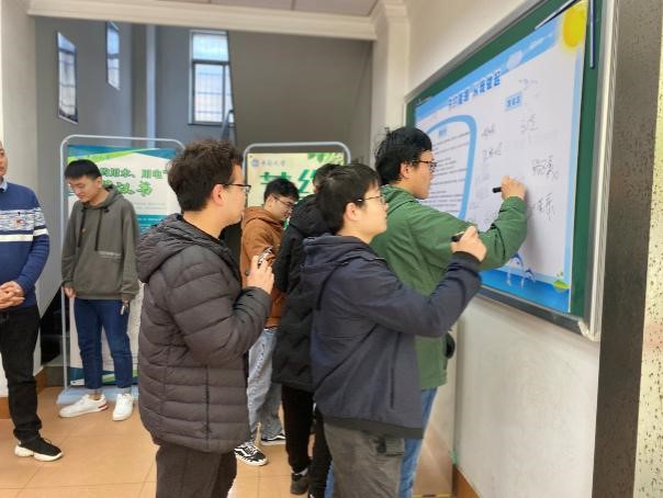 随后,研究生五党支部书记刘雯叮嘱各位同学:“我们作为党员,应该树立科学使用资源的观念,发挥党员的先锋带头作用,成为节能意识的倡导者、践行者与传播者。”参加活动的同志们在认真聆听了各位老师的叮嘱,学习了节水节电倡议书后,也纷纷踊跃发言。大家交流了关于节能意识的切身感受和践行勤俭节约传统美德的实践经验,并且表示此次活动受益匪浅,切实领悟到了节能减排的重要性,并且学到了实实在在的节能减排的方法。随后现场开展了节能宣传周的主题签名活动并且合影留念。