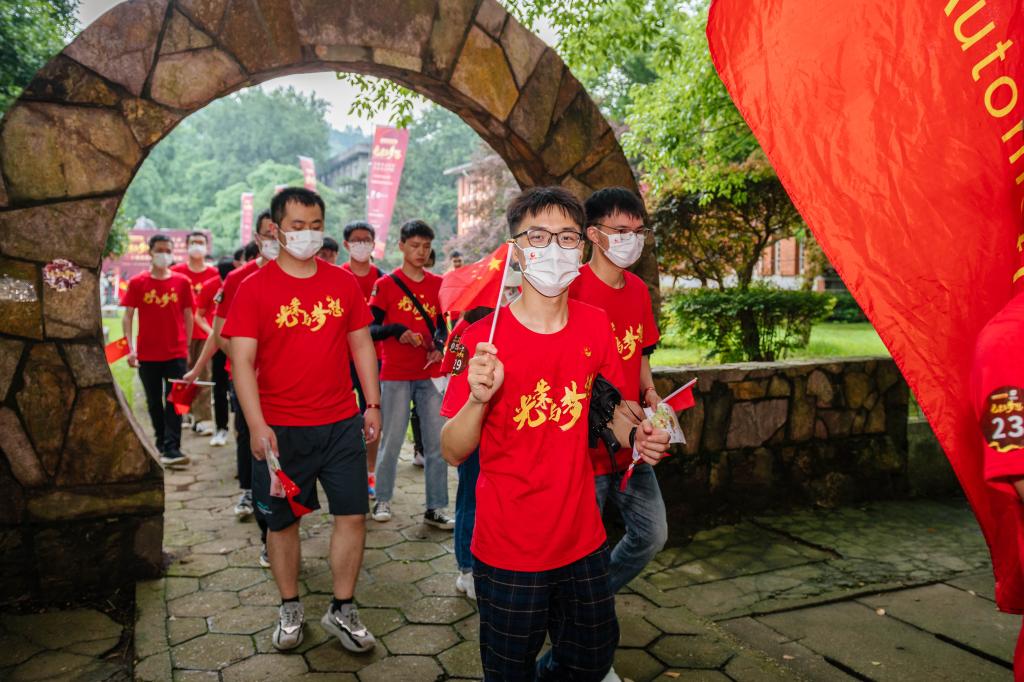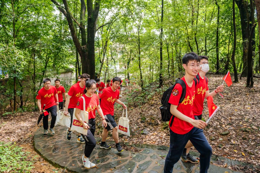 启动仪式后,党员同学们编组列队,徒步攀登岳麓山,打卡红色地标。大家从近现代保护文物、必赢766net手机版所在地民主楼出发,途径和平楼,徒步岳麓山,先后到达开国大将肖劲光雕像、爱晚亭,来到新民学会旧址,一路设有6个党史知识打卡点和微党课现场教学点。