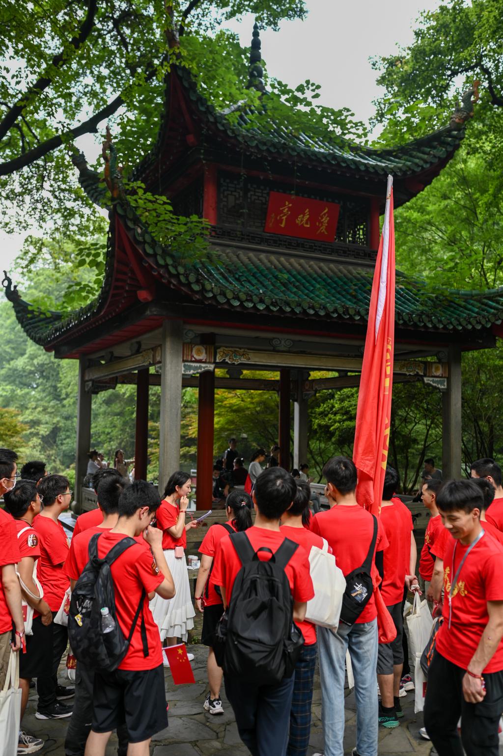 大家徒步到达“中国四大名亭”之一爱晚亭,党员代表由杜牧的《山行》一诗引出抗日战争时期在爱晚亭中发生的故事。当时,日本“二十一条”、袁世凯恢复帝制、张勋复辟给中国人民带来沉重打击。以毛泽东为代表的新一代中国青年正在探索着新的出路。而爱晚亭,也就成了他与挚友蔡和森、罗学瓒、张昆弟等聚会的地方。在这里,他们或臧否人物、议论世事,或登高吟咏、斗韵唱和。在这里,也孕育出了毛泽东最初的革命思想。听闻此言,这座琉璃碧瓦、金柱丹漆名亭在学生们的心中渐渐高大了起来,眼前仿佛浮现出当年那群学生“书生意气,挥斥方遒”的情景。