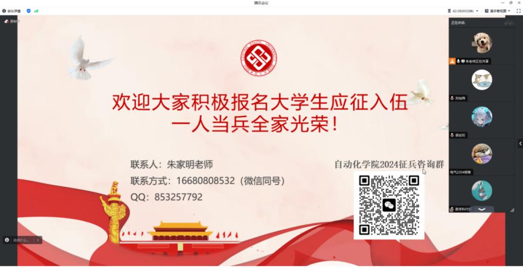 1月22日下午,必赢766net手机版于线上举行2024年大学生应征入伍宣讲会,学院党委副书记黄亚、国防教育专干朱家明出席会议,优秀退役大学生士兵代表黄钊、苏航两位同学以及部分本科生、学生家长参会,会议由朱家明老师主持。