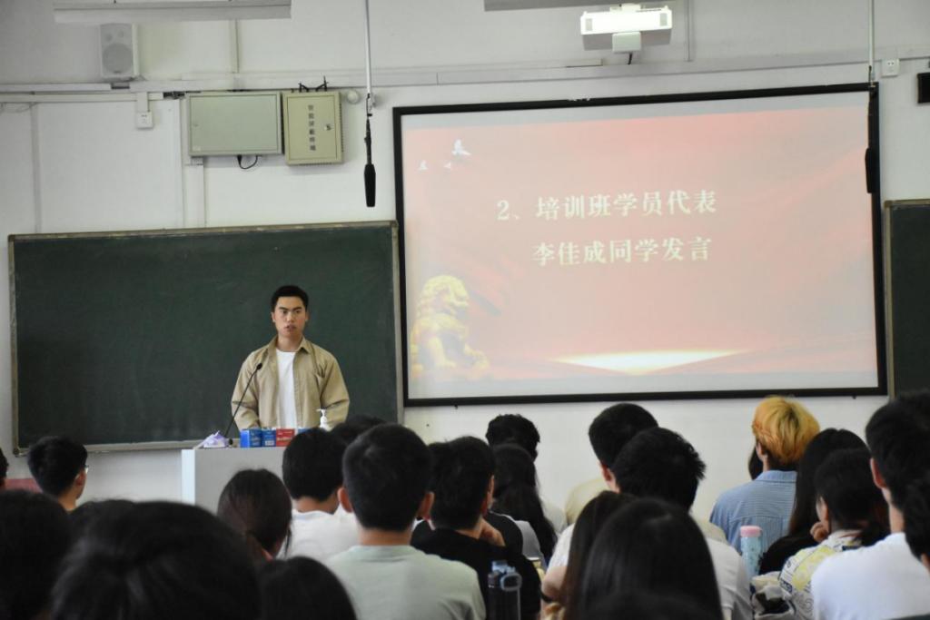 典礼开始,本科生八支部李佳成作为学员代表发言。作为一名退伍士兵,他结合自身参军入伍的经历分享了入党动机和自己渴望加入中国共产党的决心,他表示将努力学习,增强本领,在未来投入到祖国的建设中。