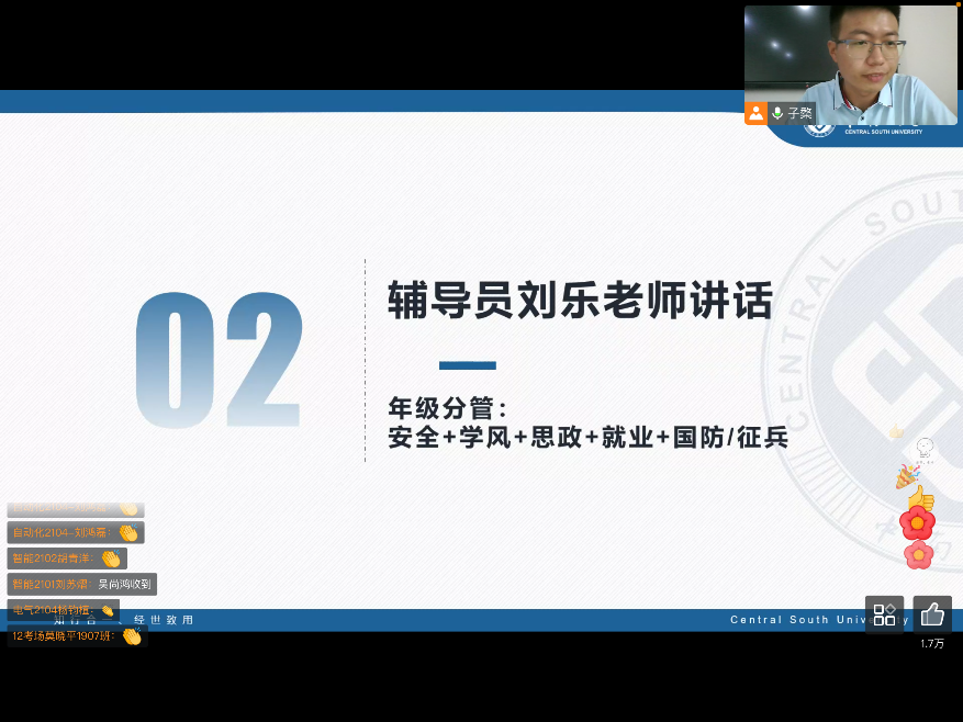 接着,辅导员刘乐老师针对年级学风问题讲话。为了给同学们提供良好学习环境,年级积极推出了辅学视频,未来还将严格执行查课制度,不断加强学风建设。他强调了学习在大学阶段的重要性并督促大家以积极态度面对学习,保研、考研还是就业?刘乐老师讲到同学们应思考人生方向,尽早进行人生规划,并朝着自己的目标不断前进,切莫浑浑噩噩,虚度大学时光。他希望大家以崭新面貌迎接大二生活,勤奋刻苦,踏实上进,为学弟学妹做好表率。