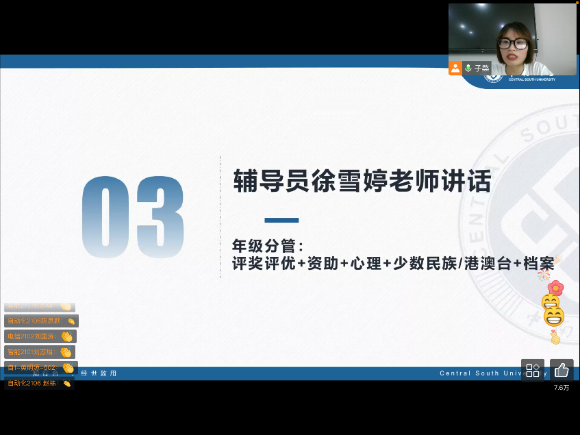 2022年9月9日下午两点,必赢766net手机版2021级线上年级大会顺利召开。2021级辅导员刘乐老师、徐雪婷老师及2021级全体同学参加本次大会,会议由徐雪婷老师主持。