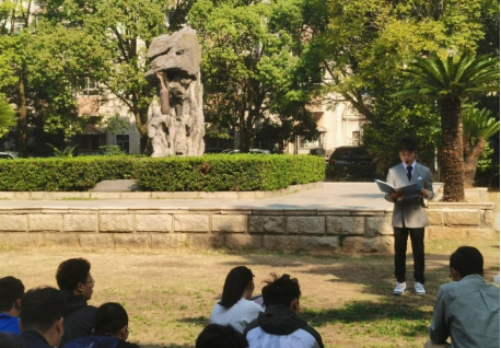 在介绍完民主楼后,讲解员为大家详细讲述了省园的雕塑。这块雕塑由一块形似东方雄狮的石头和一枚侵华日军轰炸长沙时遗留下来的炮弹组成,上面刻着“铭记历史,振兴中华”的碑文。这块雕塑背后,是当时高校师生在艰苦环境中对学问的专注,更是永不妥协的勇气与坚毅。