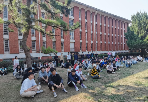 大家在民主楼后草坪集合后,讲解员先为大家介绍了民主楼的由来。民主楼是中南大学现存最早的建筑之一,它独特的中西结合的建筑特点使民主楼既能体现中国的传统审美,又能满足现代建筑的需要。