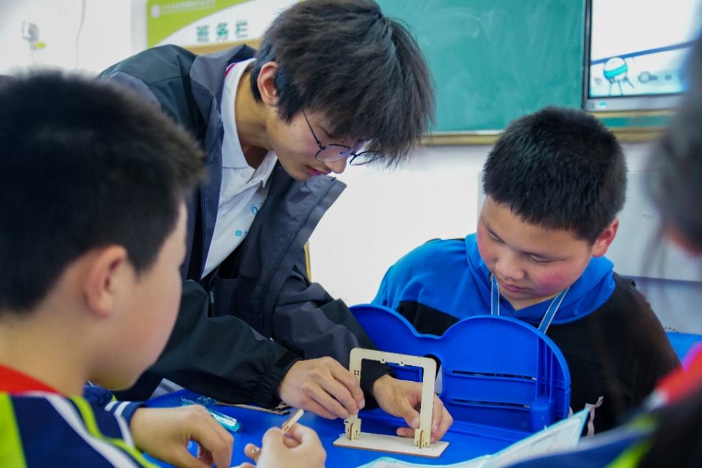 首先,团学会支教成员用通俗易懂的语言为学生们讲述关于电和磁的科学知识。支教老师通过播放生动有趣的视频、分享生活中的相关事例等方式加深学生们对电磁知识的理解,并鼓励学生们积极开动脑筋回答问题。在活泼的师生互动中,课堂充满了学习的乐趣。随后,团学会支教成员分别演示了“电磁秋千”和“电磁起重器”两个实验小装置。支教老师鼓励学生们在观察学习后,将理论知识与动手实践相结合,独立自主完成实验。最终,大部分学生成功将课堂学习知识运用到实验中去,取得了良好教学成果。