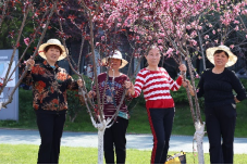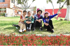 志愿者与老人在后湖艺术园拍照