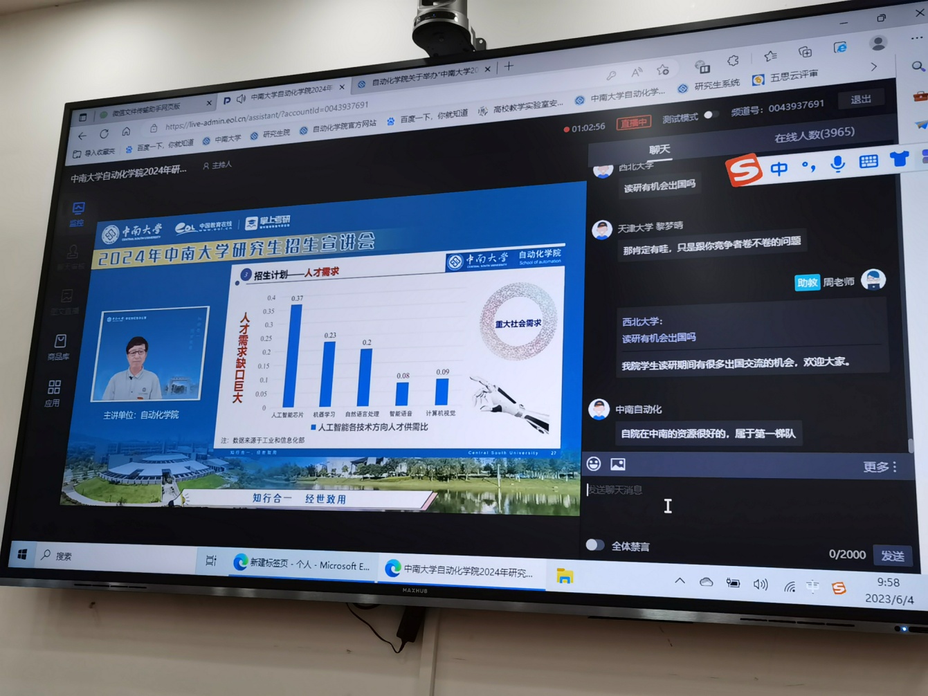 为满足考生对研招政策咨询需求,建立学院与考生之间高效的信息沟通渠道,在中南大学研究生院的指导下,必赢766net手机版于2023年6月4日上午举办主题为“‘自’慧创新,‘动’察世界”的2024年研究生招生直播宣讲会。活动前期,学院通过平台公众号、研招宣传QQ群广泛进行海报宣传,受到了广大考生的密切关注和热烈反响。