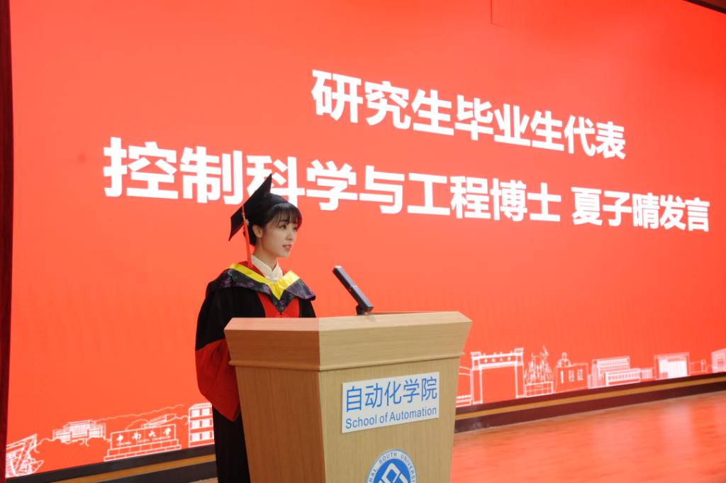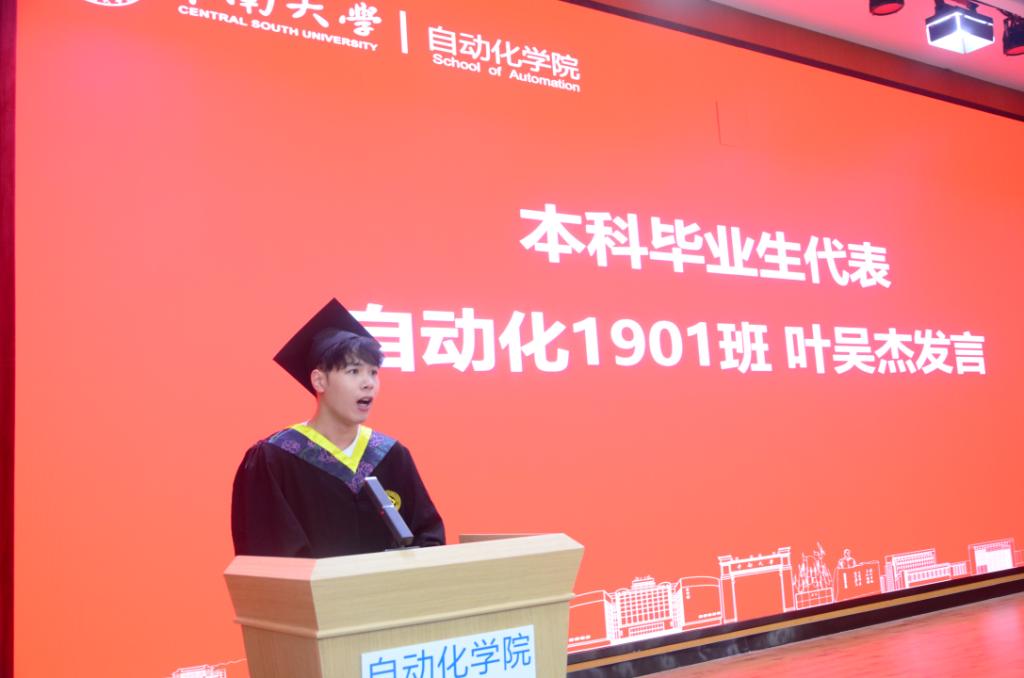 本次仪式在庄严的国歌声中拉开序幕。本科毕业生代表叶吴杰结合自己四年的求学经历进行了发言,他说:“无论我们走到哪里,我们都已经深深印上中南的烙印。”随后,毕业生代表博士研究生夏子晴号召同学们以青春之我,赴时代之约,不负自己、不负学院、不负祖国,谱写新时代的奋斗篇章。教师代表我系支部书记董密教授则寄语全体毕业生“青春可以毕业,但梦想不能毕业”“时光可以毕业,但情谊不能毕业”,她勉励毕业生们勇挑重担、堪当大任,在实现中华民族伟大复兴的征程中志道弘毅、砥砺前行。