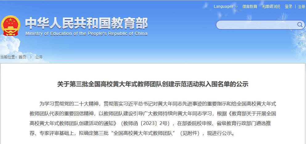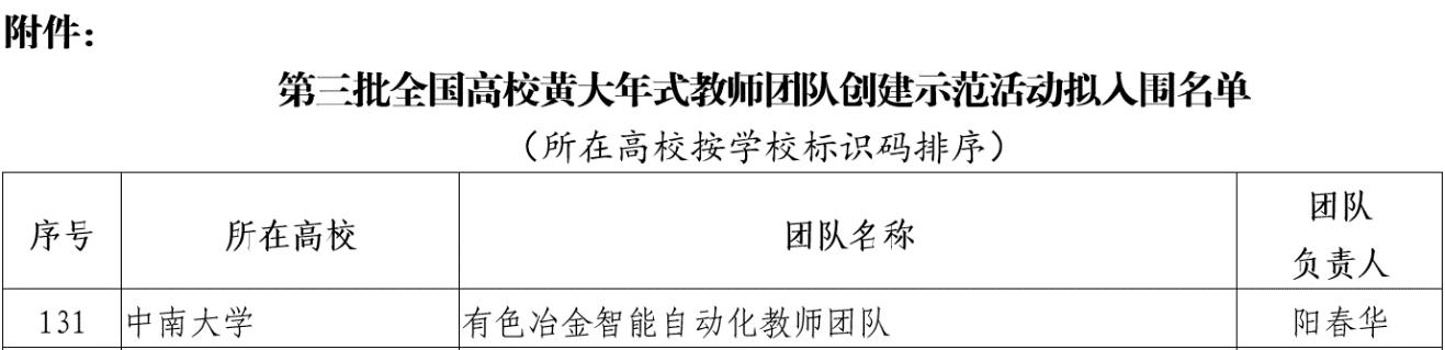 7月28日,教育部发布《关于第三批全国高校黄大年式教师团队创建示范活动拟入围名单的公示》,在部委院校申报、省级教育行政部门遴选推荐、专家评审基础上,拟确定第三批“全国高校黄大年式教师团队”共199个。其中,学院“有色冶金智能自动化”教师团队成功入选。