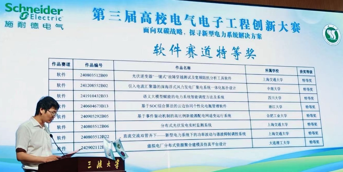 2024年8月10至12日,第三届高校电气电子工程创新大赛全国总决赛在三峡大学隆重举行。我院学子凭借作品《引入电流汇聚器的深海浮式风力发电场集电系统一体化拓扑设计》斩获软件赛道全国特等奖(全国共8项),实现了我校在该项赛事上的首次突破!