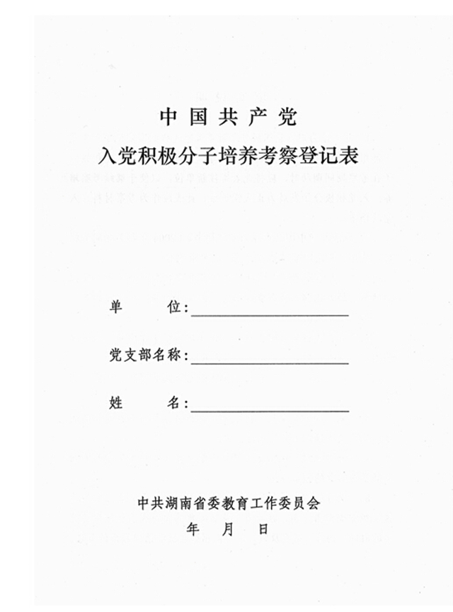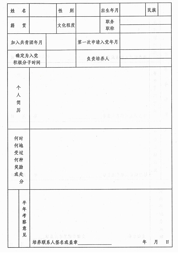 ②此表每学期开学第三周由支部下发到入党积极分子并指导填写,下发、填写工作与入党人员信息统计工作同时进行。封面填写时间应与表内“确定为积极分子的时间”一致;表格的内容应填写完整。