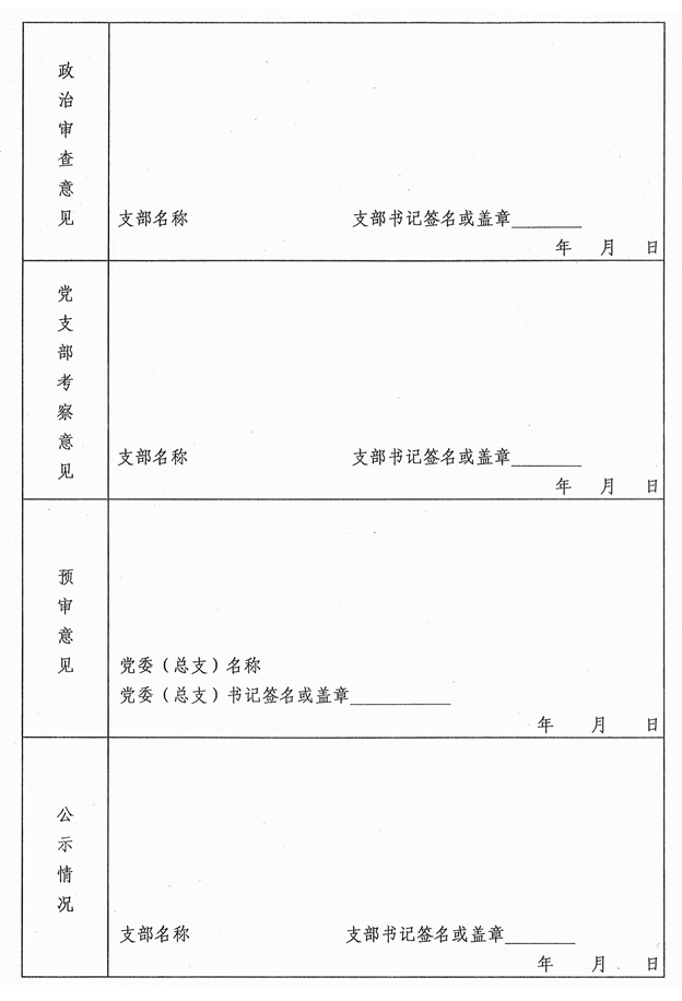 ⑥“党支部考察意见”应填写入党积极分子在考察期间的表现,以及党支部作出的结论性意见。