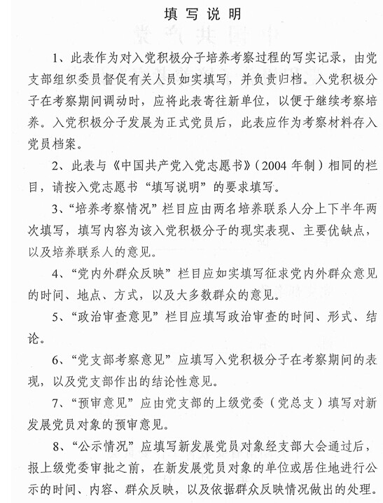 ⑨此表作为对入党积极分子培养考察过程的写实记录,由党支部组织委员督促有关人员如实填写,并负责归档。入党积极分子在考察期间调动时,应将此表寄往新单位,以便于继续考察培养。入党积极分子发展为正式党员后,此表应作为考察材料存入党员档案。
