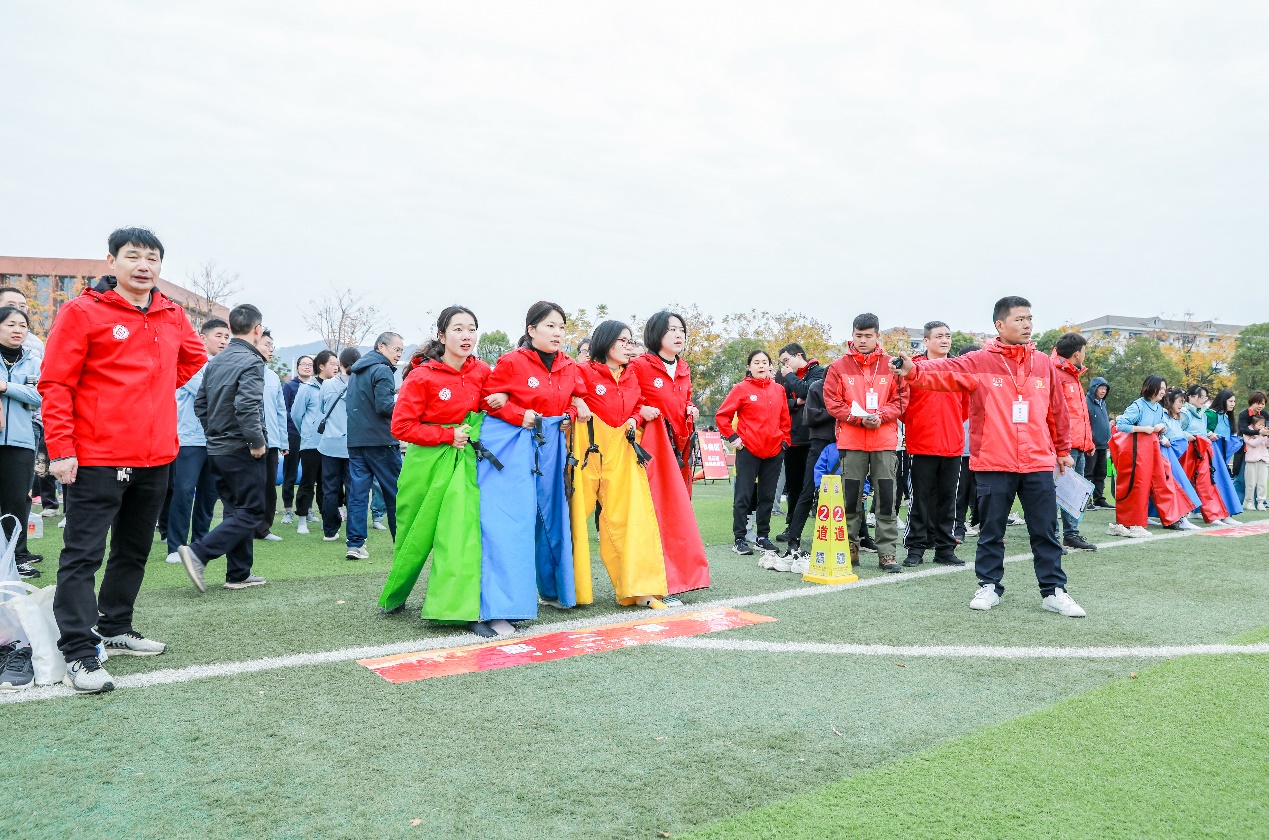 本次趣味运动会以团体项目为主,集协作性、娱乐性和竞争性于一体。在“趣味飞盘”项目中,教职工们身手敏捷,准确地将飞盘一个个掷入最高分值“9”的方框中,赢得了阵阵掌声;在“屹立不倒”项目中,运动员围成一圈,紧随口令节奏一致,迅速、准确地接稳前方队友传递来的充气柱,充气柱稳如泰山、屹立不倒;“快乐一起拼”项目是智力和体力的双重比拼,队员们快速、有序、准确地将一块块拼图放置在合适位置;在“共赴未来”项目中,教职工们将左右腿分别套在形似皮筏艇的道具中,喊着统一的口号、迈着整齐的步伐奋力向前;在“齐心协力”项目中,大家四人一组,套着连体裤一同向着终点奋力奔跑。整场运动会竞技性、趣味性十足,赛场气氛欢快活跃,大家尽享运动带来的快乐时光,也充分展现了必赢766net手机版团结协作、积极向上的精神风貌。