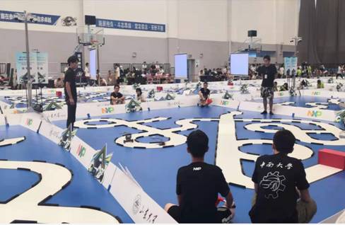 在开幕式上我校自动化1608班孔维航同学代表全体参赛选手宣誓,获得了极大好评。来自全国的选手们在四轮组、三轮组、双车会车组、无线节能组、信标组、室外电磁组、室外光电创意组、室内对弈创意组等八个组别展开了激烈的角逐。