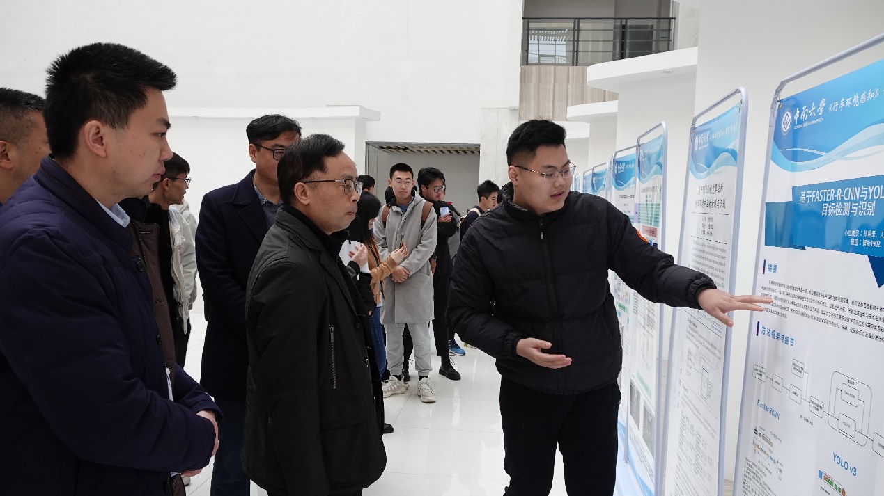 走进宽敞明亮的信息楼大厅,首先映入眼帘的是一列排开的湘江班同学们精心设计的海报。大家的海报或选题新颖,或排版精美,部分小组采用了纯英文的撰写方式,让前来参观的老师同学们眼前一亮。上午9时许,王院长带队对所有展板进行了巡视。在大家精心制作的海报前,所有小组的成员神采奕奕地为前来的老师和同学们进行讲解,自信地展示了自己小组的研究成果。王院长仔细聆听了每个项目的介绍,并做了细致的点评。巡展结束后,王院长高度评价了同学们做出的成绩,充分肯定了湘江班和行车环境感知课程的教改工作,并对同学们在人工智能领域的学习深造寄予了深切的期望和美好的祝福。
