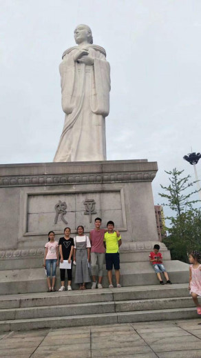 图为杨潇与马文艳(左一)在泸溪县城与小摄影师的合影