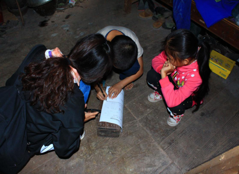 图为马文艳在指导八什坪小学贫困学生杨自海填写相关表格